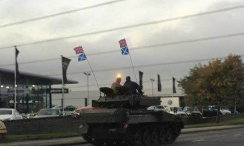 Weel, it’s been an ironclad wik in the village. Some of you micht have seen that a great muckle tank wis spotted trundling up Wellington Road in the distant royal burgh of Torry. Noo, if onybody had looked closely at the driver, they would have seen a muscle-bound thick-set figure, wi a lantern jaw and eyes close-set in concentration, nae unlike Sly Stallone in his pomp, chawin’ on a massive cigar. At’s richt, it wis naen ither than Feel Moira taking her new run-aboot for a spin. It truly is amazing fit ye can find on Gumtree. She’s delighted wi the purchase; the caterpillar tracks are ideal for the rough terrain aroon aboot Meikle Wartle, and the 30mm L21A1 Cannon comes in real handy for clearing a path through the roadworks at Oldmeldrum.